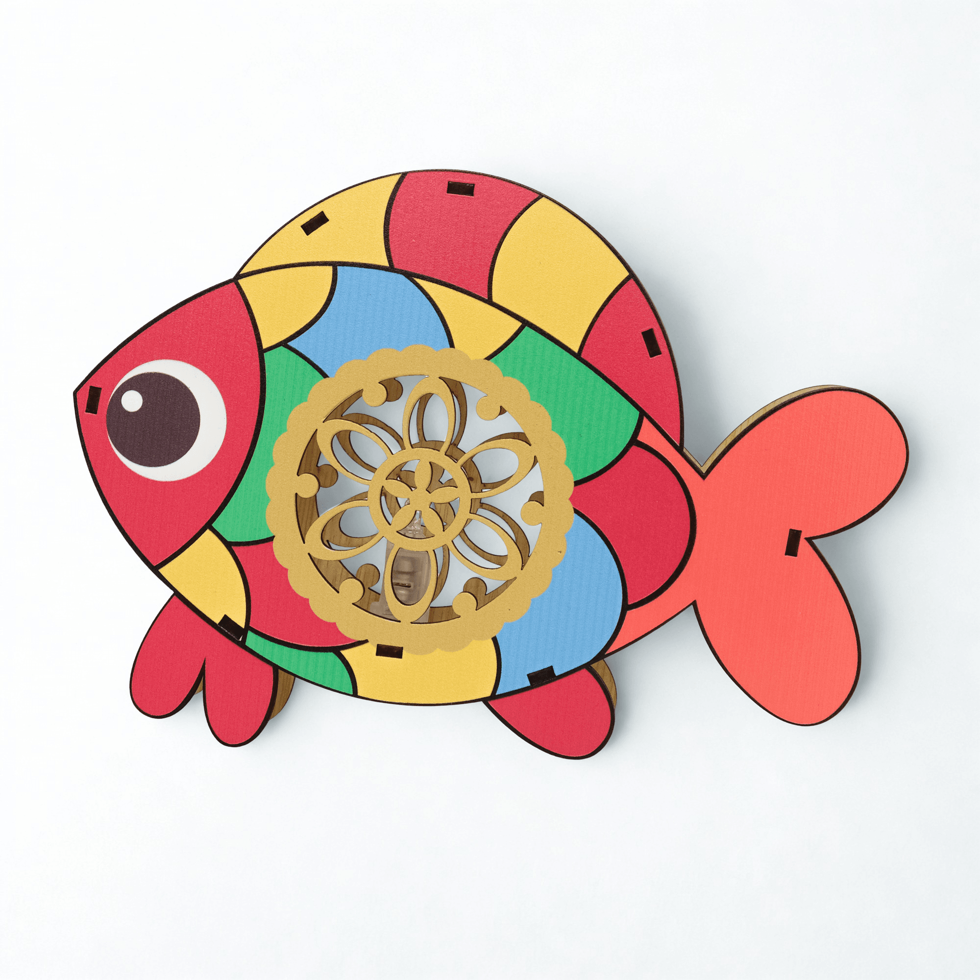 Thân cá được chia thành các mảng màu nổi bật: đỏ, vàng, xanh lá, xanh dương, kết hợp cùng mắt tròn và chiếc vây xinh xắn. Ở phần bụng cá là vòng hoa văn tròn bằng gỗ, như một cửa sổ nhỏ – nơi ánh nến lung linh có thể chiếu qua tạo nên hiệu ứng ánh sáng rất đẹp.